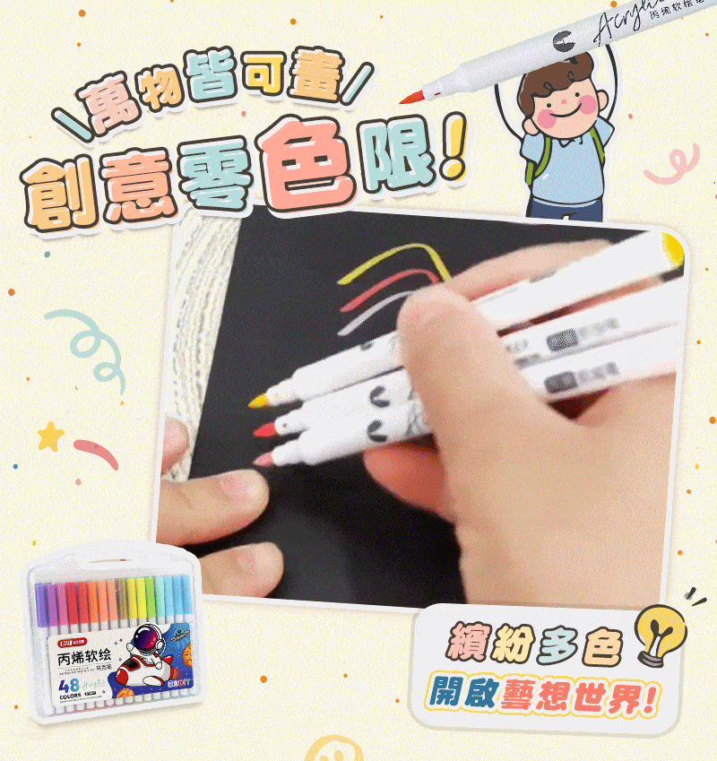 12分鐘前丙烯彩繪馬克筆 超強覆蓋力,萬物材質皆可畫,專為兒童研發,輕鬆擦拭不卡色 - 【一套】丙烯彩繪馬克筆 (48色)NT$580